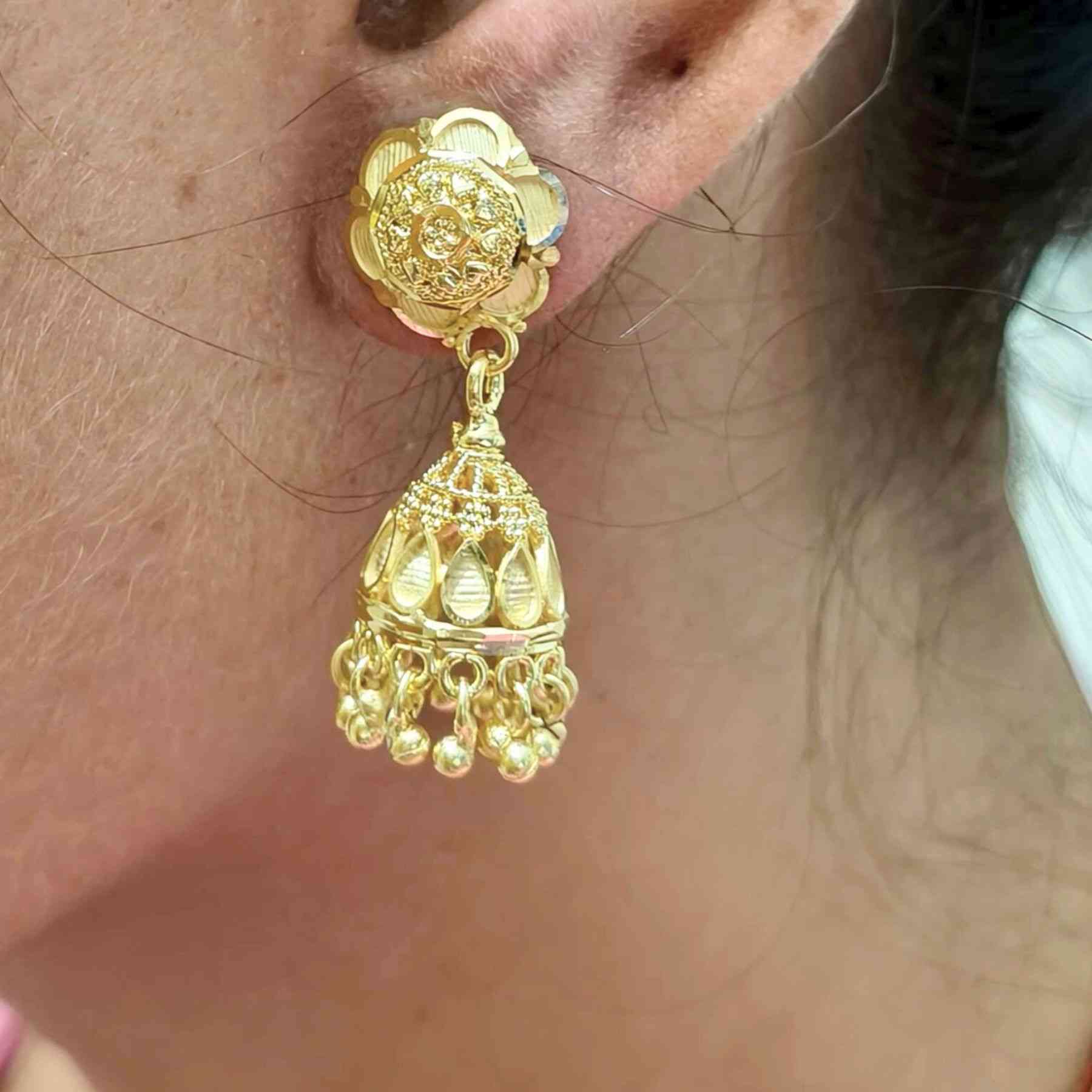 Radiate royal charm with these 1gm real gold plated Jhumar-pattern lightweight jhumkis — a graceful blend of heritage and elegance.
