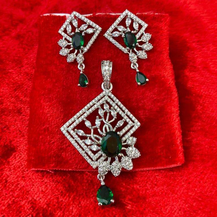 Luxury Aqua Green American Diamond Pendant With Matching Earrings (SG4002)
