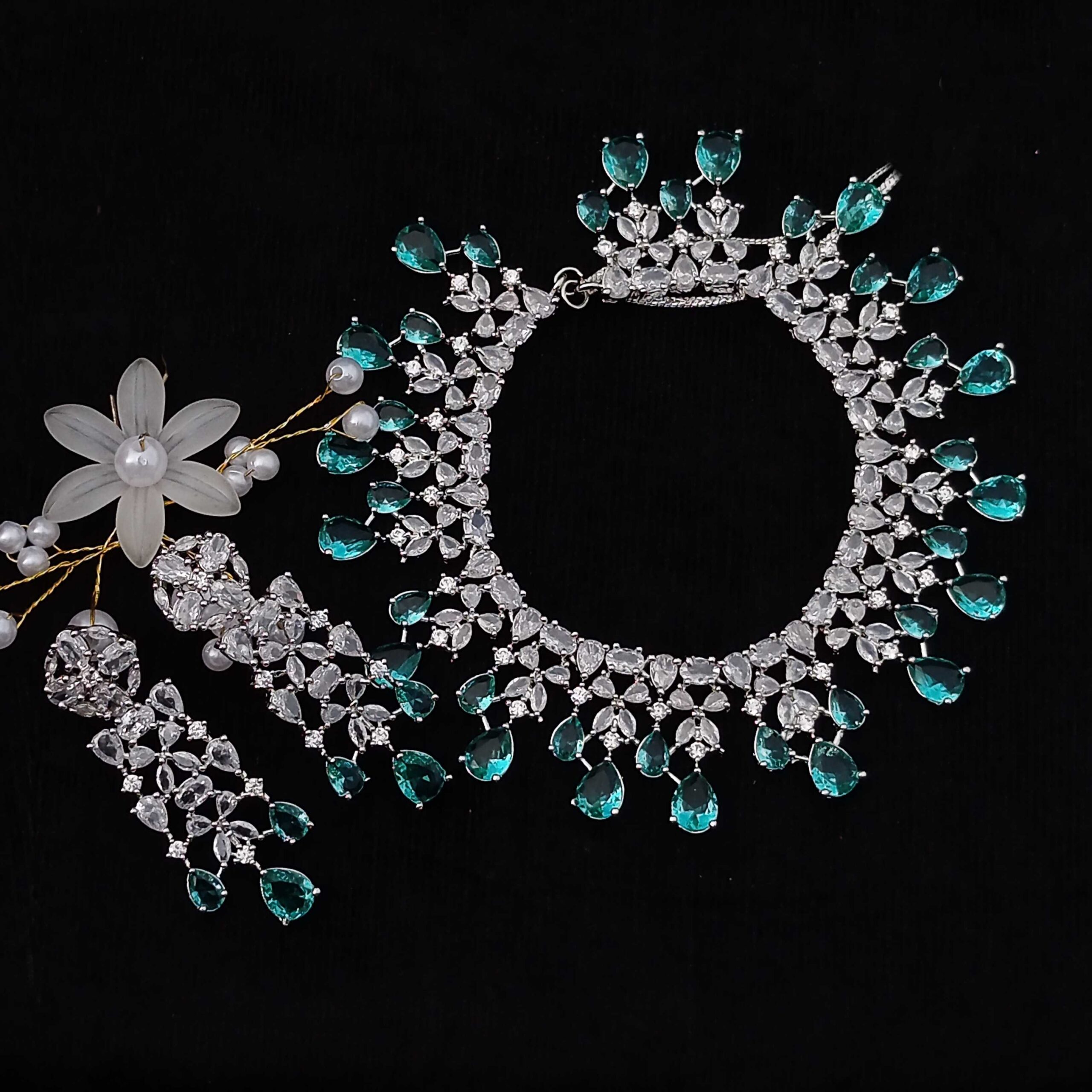 Mint Colour Flower American Diamond Necklace set With Matching Earrings(SG40478)