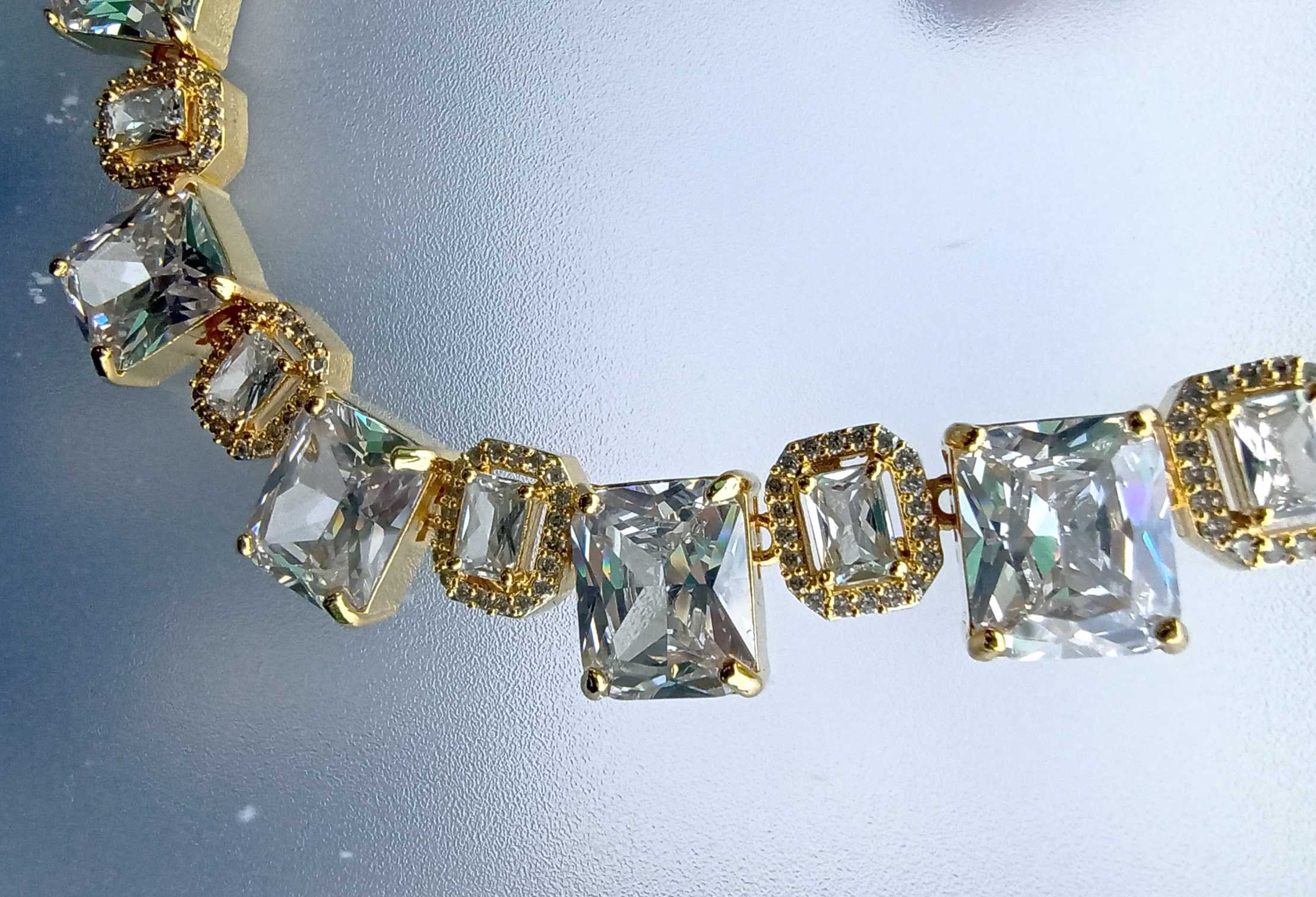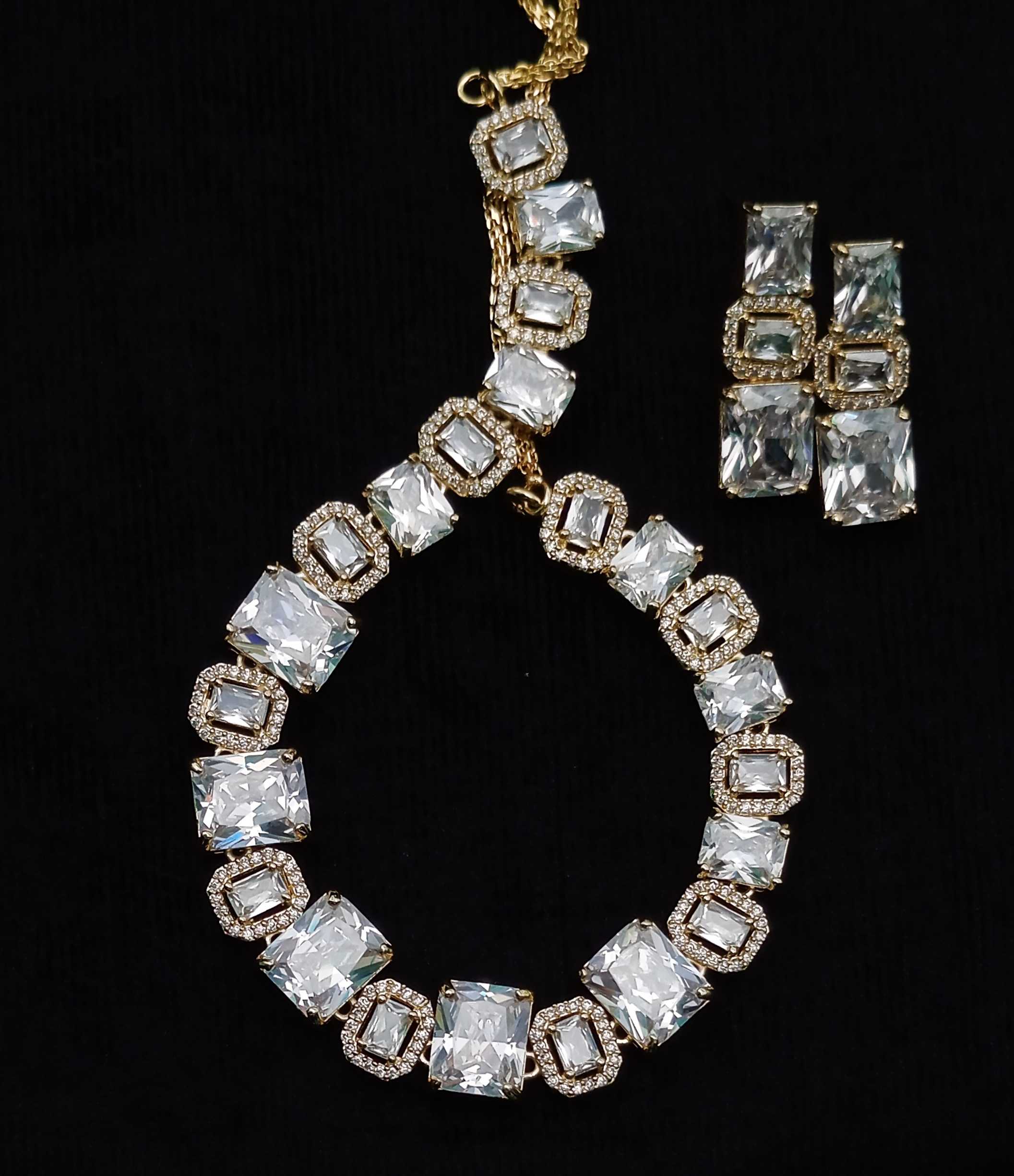 Occasion : Western, Birthday Party, Engagements, Out door CelebrationBase Metal: CopperColor: GoldenStone Type:Â Zirconia Glass StoneType: Cubic Necklace and EarringsPlating: Rhodium-PlatedWarranty: Only if Damage product received and You must have Unboxing Video.