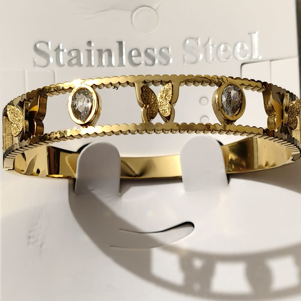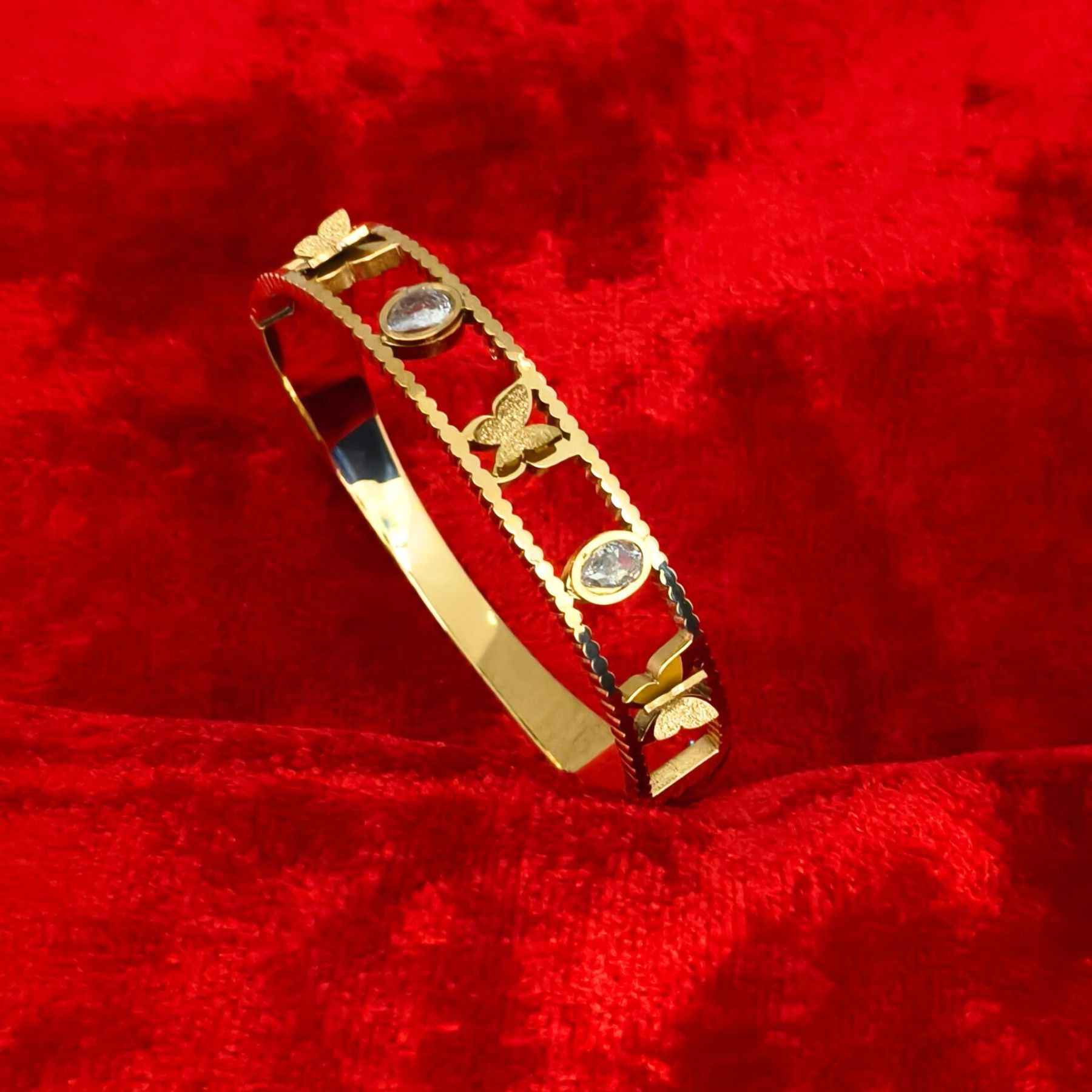 Featuring a graceful butterfly motif adorned with sparkling American Diamonds, this bangle-style bracelet is crafted from premium stainless steel with a luxurious gold plating. Its anti-tarnish finish ensures long-lasting shine, making it perfect for both special occasions and adding a feminine touch to your daily look.