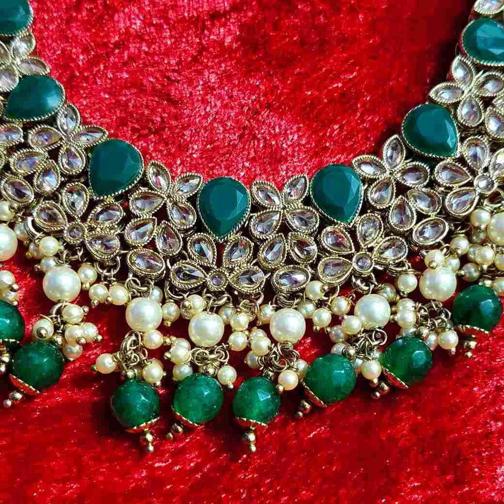 Make a regal impression with this Green Monalisa Stone Necklace Set, featuring a stunning reverse American diamond flower replica design and a matching tika. Crafted from premium casting alloy and finished in elegant gold tone, this matt green necklace set is ideal for weddings, festivals, and bridal occasions. A perfect choice for women in Bihar who love traditional Indian artificial jewellery, costume sets, and elegant bridal accessories.