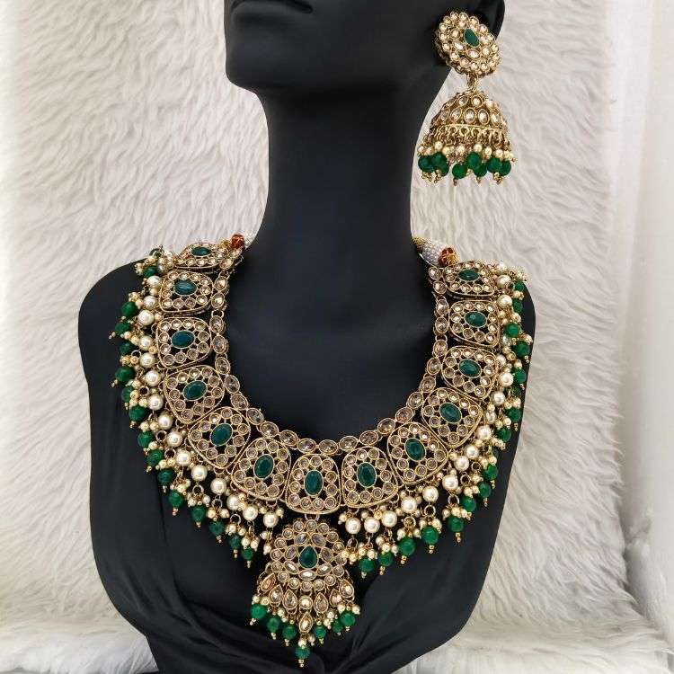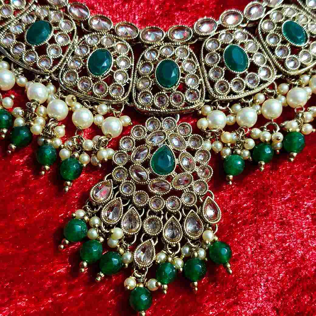 Elevate your festive and bridal look with this elegant Green Monalisa Stone Necklace Set, adorned with a reverse American diamond replica design and a matching tika. Made from durable casting alloy and finished in rich gold tone, this set blends traditional grace with modern sparkle. Ideal for weddings and special occasions, it’s perfect for women in Bihar who love artificial jewellery, costume bridal sets, and statement ethnic pieces.