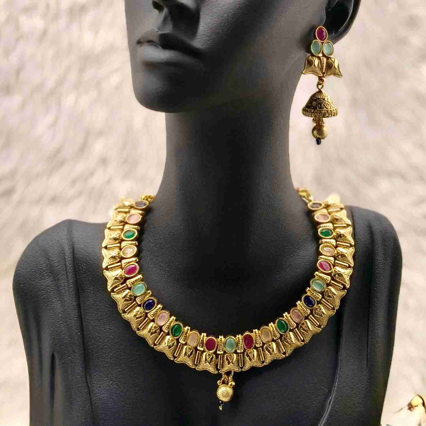 Add a splash of elegance to your look with this Multi-Colour Gold Plated Necklace and Matching Earrings – a perfect blend of vibrant charm and timeless grace.