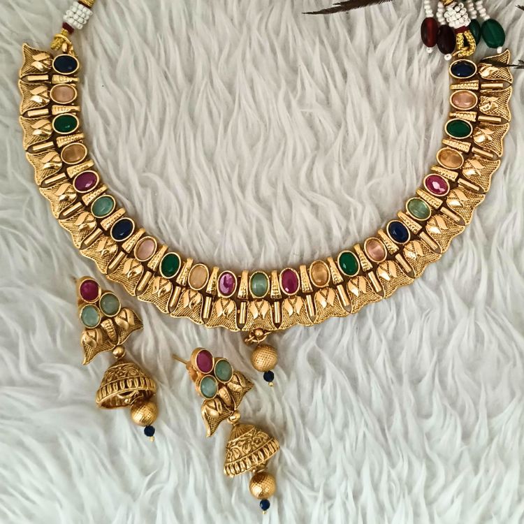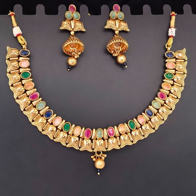 Add a touch of vibrant elegance to your festive or bridal attire with this Multi Colour Gold Plated Necklace Set. Crafted from high-quality copper base metal and finished in luxurious gold polish, the set features bright multi-colored stones and matching earrings. A perfect pick for women in Bihar who love Indian artificial jewellery, fashionable costume jewellery, or need a statement bridal accessory for special occasions.
