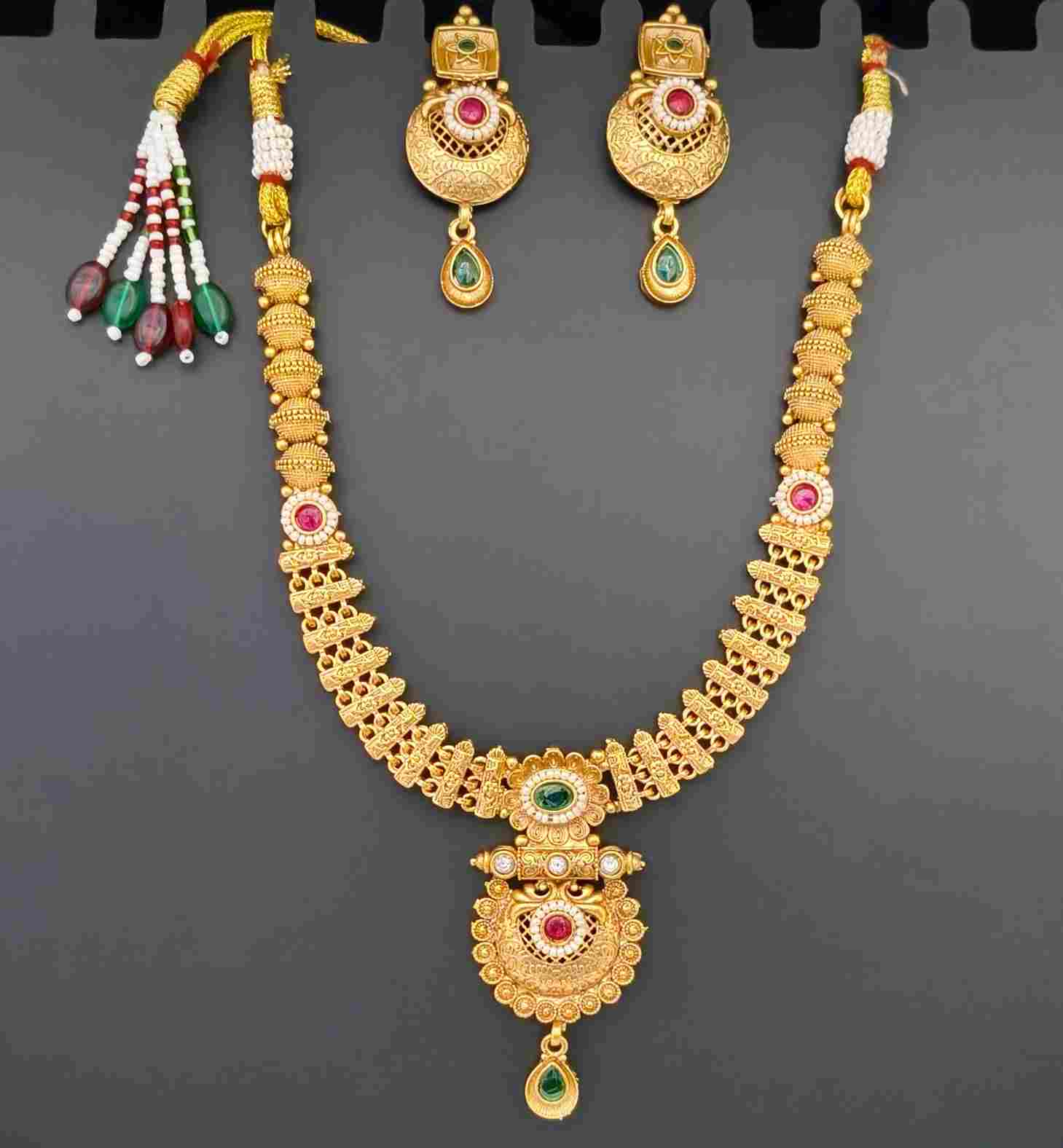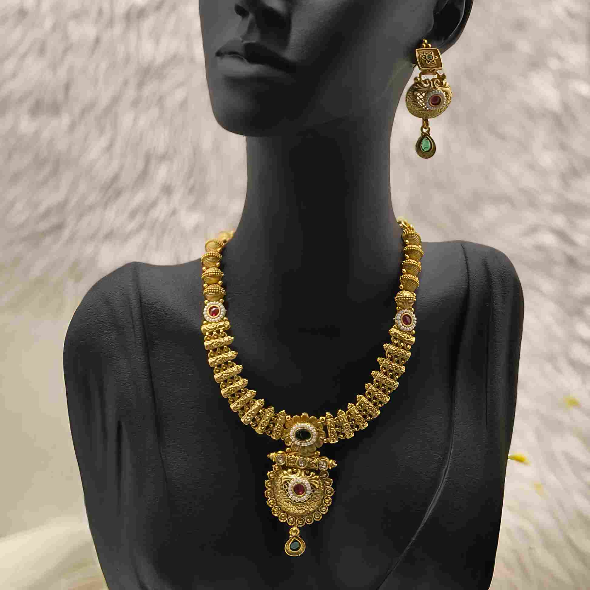 Elevate your ethnic ensemble with this Multi Colour Matt Gold Plated Polki Necklace Set, crafted with a refined copper base metal and finished in a rich matte gold polish. Adorned with vibrant multi-colored stones and paired with matching earrings, this traditional yet stylish set is perfect for weddings, festivals, and special occasions. A must-have for women in Bihar seeking artificial bridal jewellery, costume jewellery, and timeless Polki necklace sets.