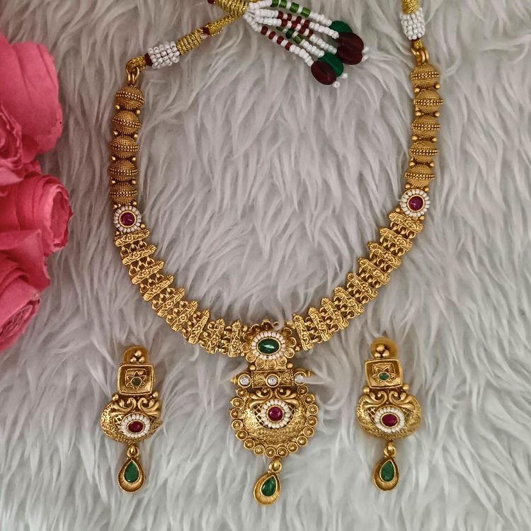 Make a bold ethnic statement with this Multi Colour Matt Gold Plated Polki Necklace Set. Pair it with a silk saree, lehenga, or anarkali to enhance your festive or wedding look. The rich matt gold finish and vibrant stones add a regal touch, making it perfect for traditional occasions and celebrations.