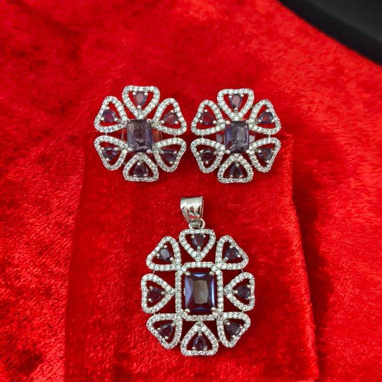 Purple Rectangular Luxury American Diamond Pendant With Matching Earrings (SG35360)