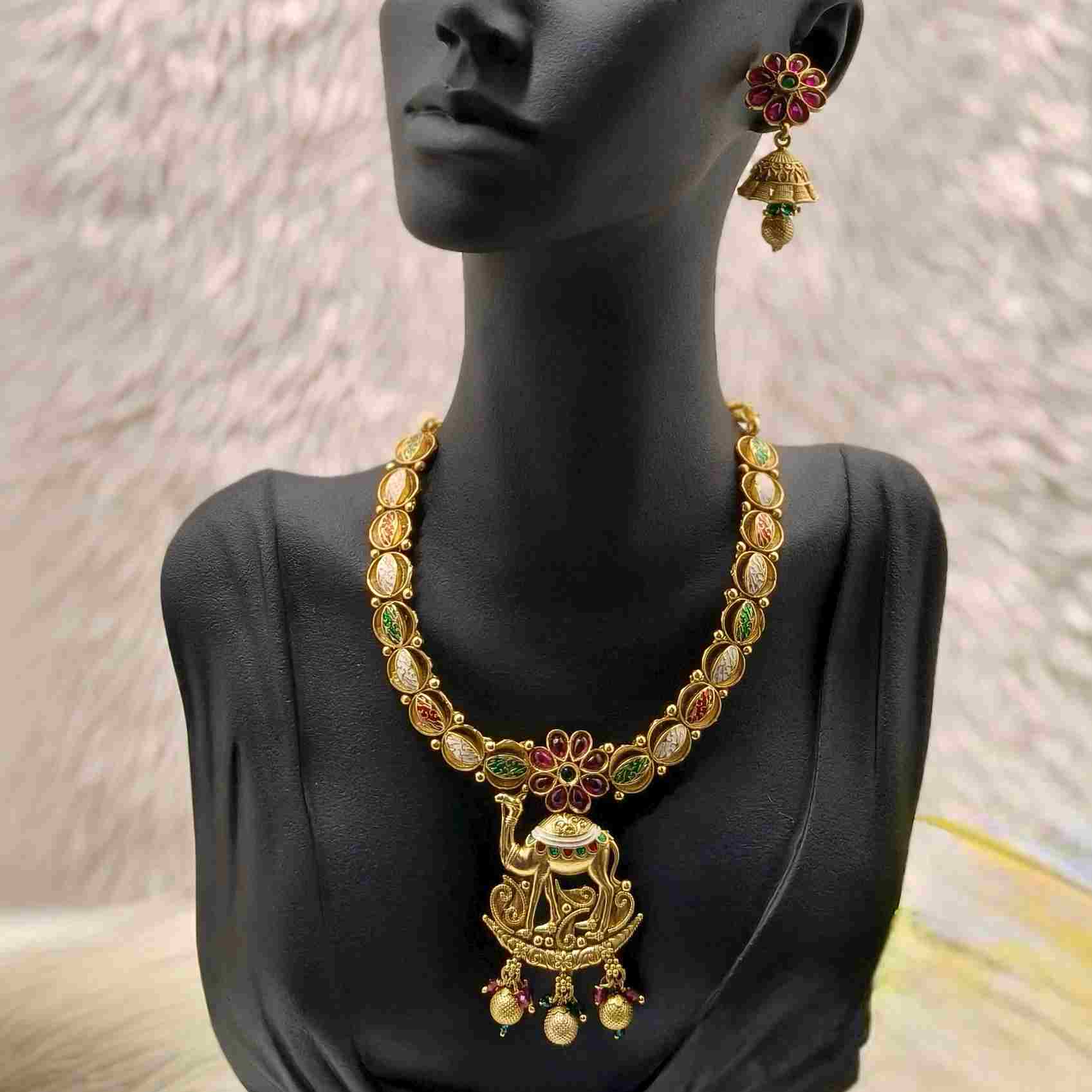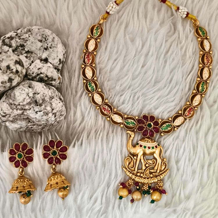Make a bold ethnic statement with this Rajasthani Style Gold Plated Necklace, adorned with a majestic camel pendant – a true symbol of tradition, royalty, and desert charm.