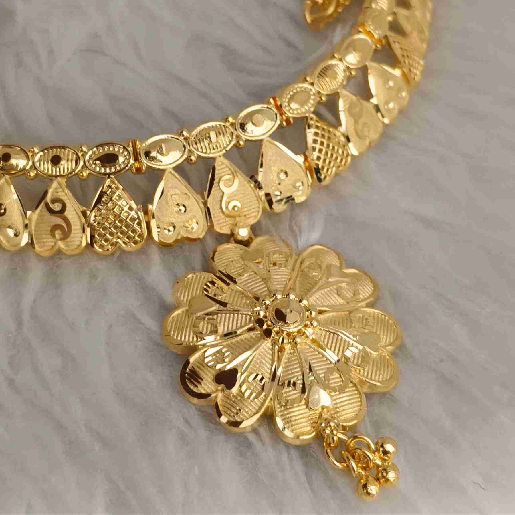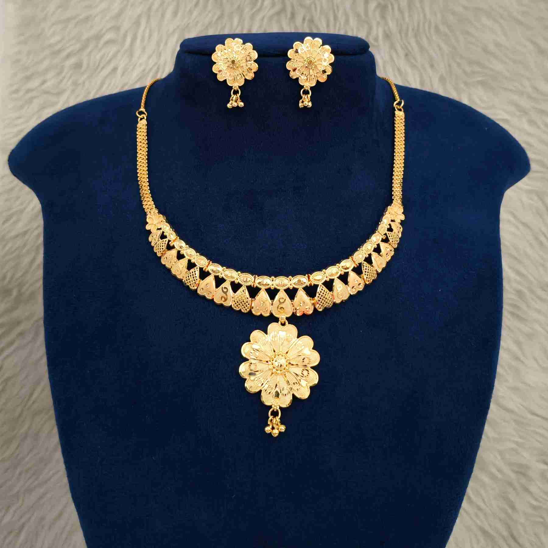 Enhance your ethnic elegance with this Real Gold Plated Lightweight Necklace Set, featuring a beautiful flower pendant design and matching earrings. Crafted from premium copper base metal with a glossy gold finish, this set offers a traditional yet lightweight style, ideal for daily wear, festive looks, and bridal functions. A perfect pick for women in Bihar who admire artificial jewellery, copper-based gold sets, and ethnic statement pieces.