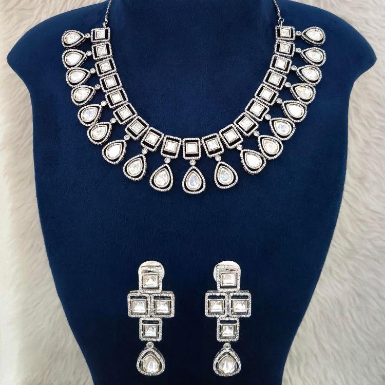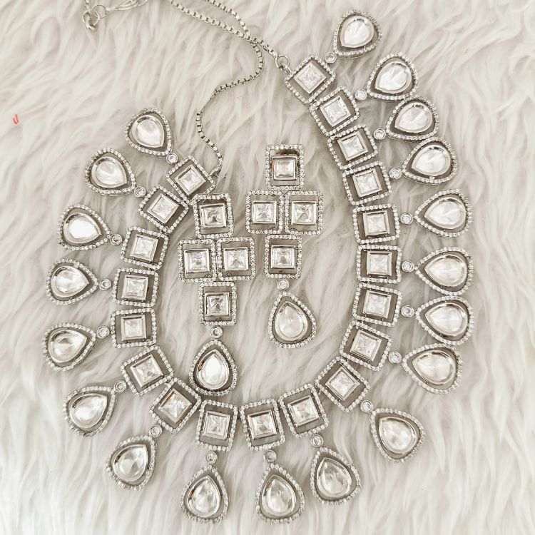 Silver Square Kundan Polki With Micro American Diamond Necklace Set With Trendy Stud Earrings (SG351950)