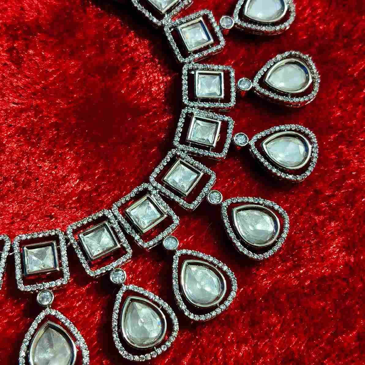 Add a modern twist to tradition with this Silver Square Kundan Polki Necklace Set featuring dazzling Micro American Diamonds and trendy stud earrings. Crafted on a durable silver-finish copper alloy base, this elegant set is perfect for Bihar-based women looking for affordable bridal, festive, or costume jewelry.