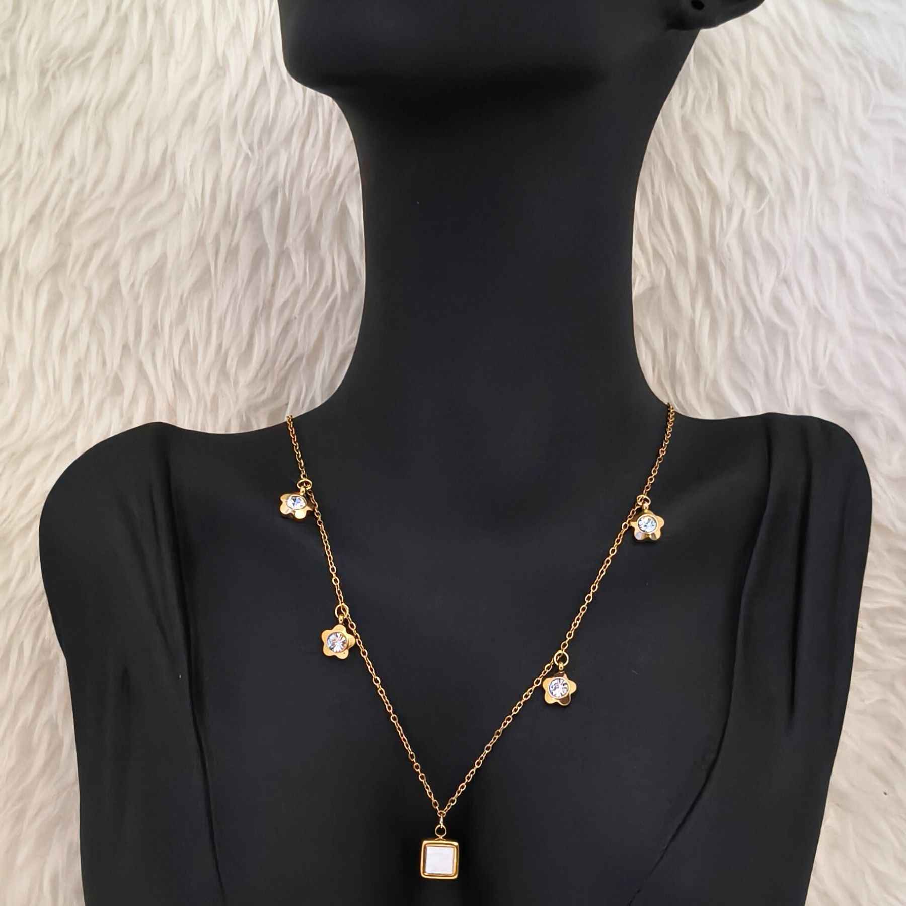 Make a bold yet elegant statement with this Square White Stone Gold Plated Stainless Steel Chain for Girls. Crafted with a luxury anti-tarnish finish and durable design, this necklace blends classic sophistication with modern appeal. Ideal for women in Bihar who prefer premium-quality artificial jewellery that’s skin-friendly and perfect for all occasions.