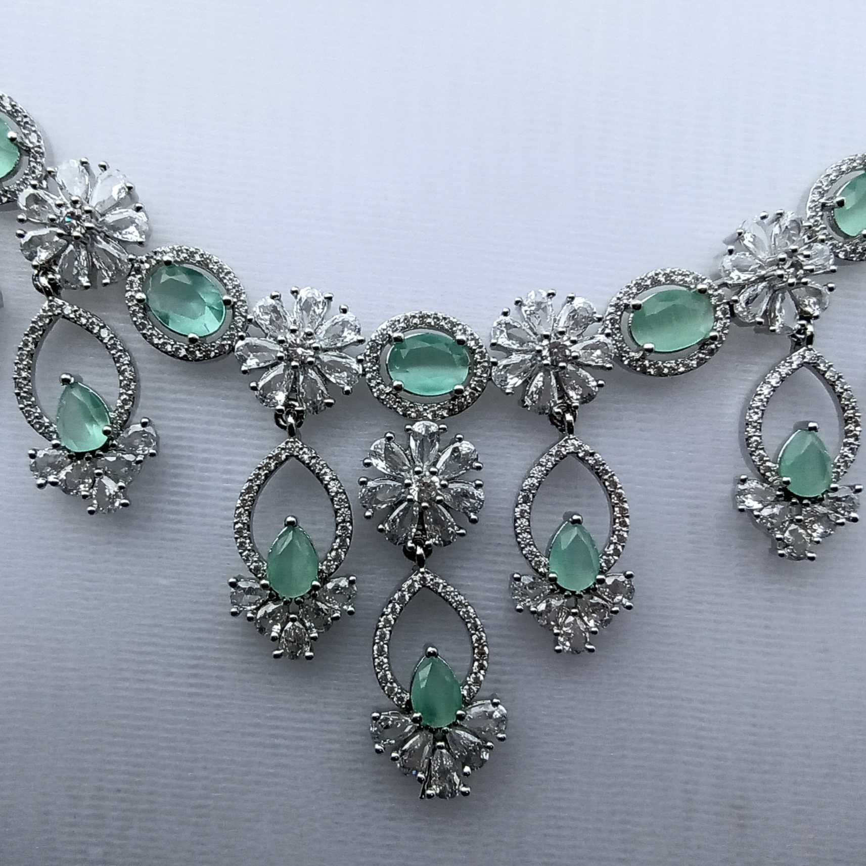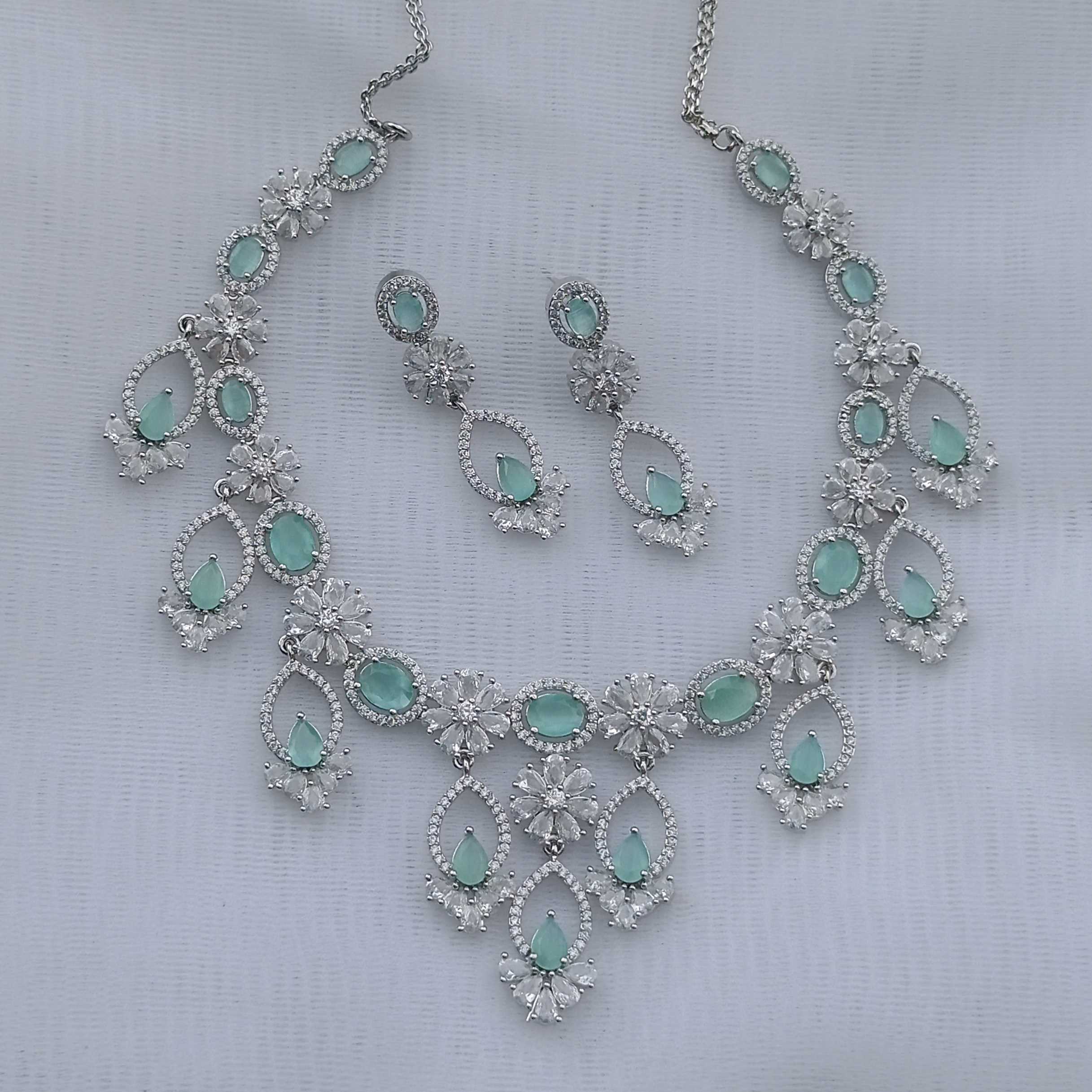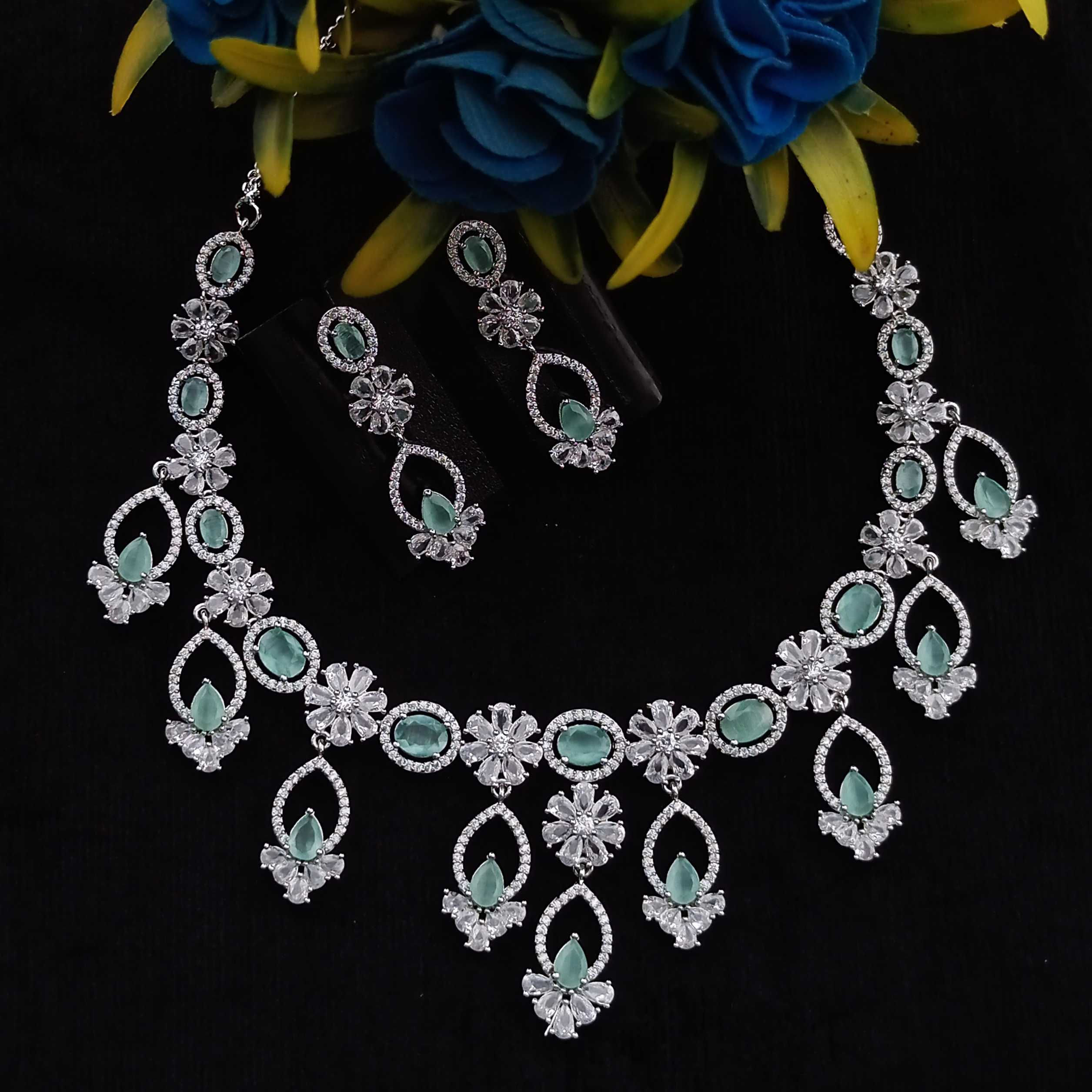 Mint Colour Flower American Diamond Necklace set With Matching Earrings(SG40478)
