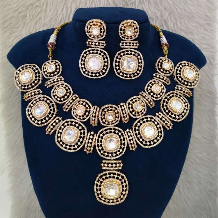 Make a statement with this White Kundan Polki Double Layer Necklace Set, beautifully crafted with micro American diamonds and a traditional golden finish. The elegant double-layer design and matching earrings enhance its bridal appeal. Made from high-quality copper alloy, this piece is perfect for weddings, festive occasions, and cultural events. A must-have for women in Bihar who love artificial bridal jewellery, costume jewellery, and premium ethnic accessories.