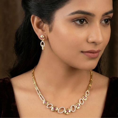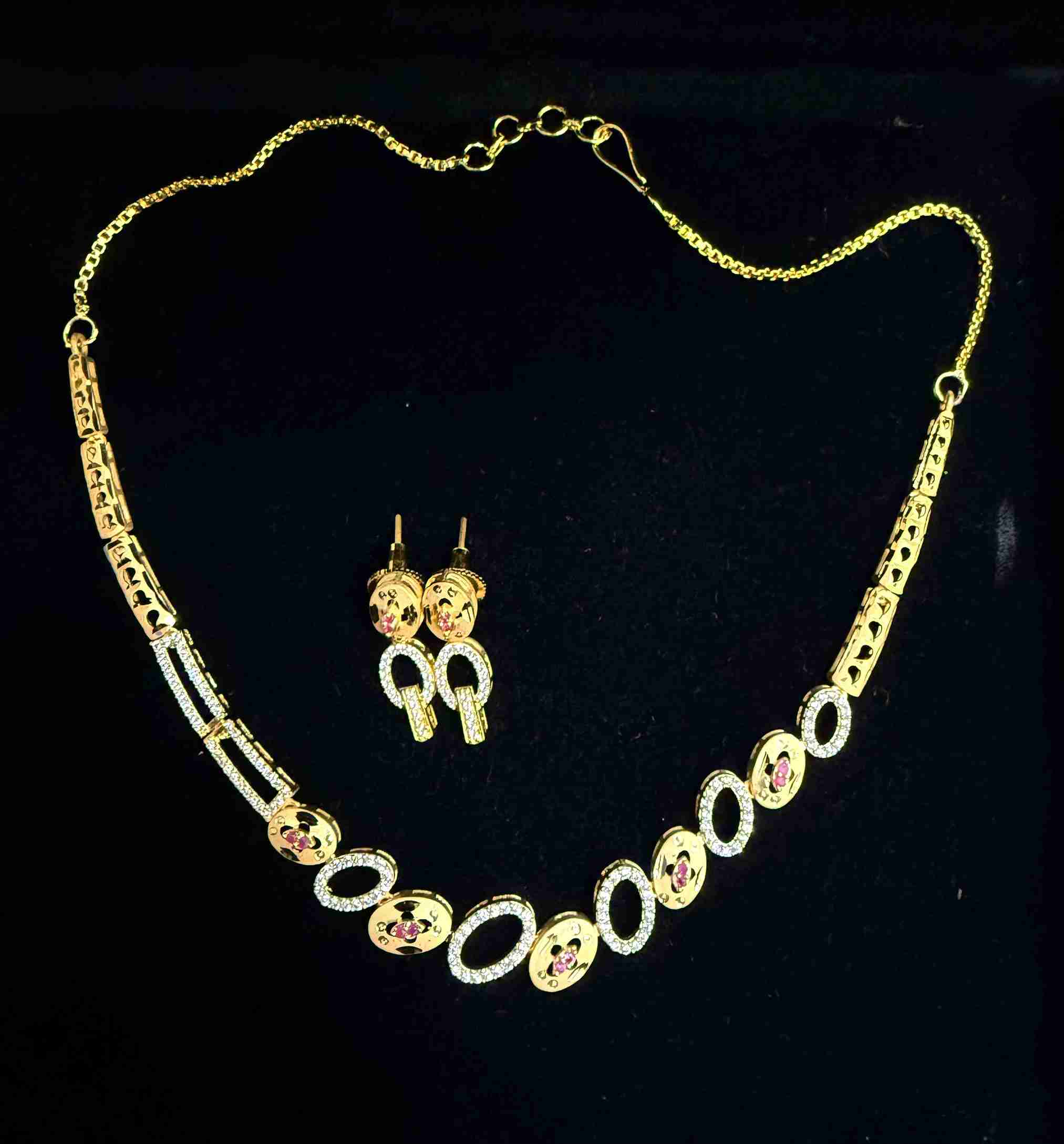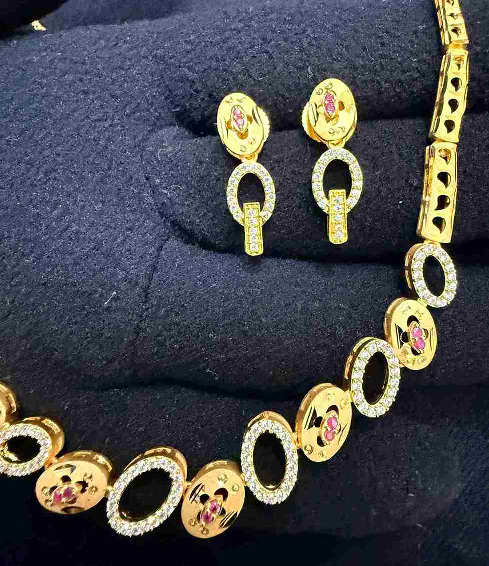 Elevate your festive and bridal style with this Forming Gold Studded Oval Necklace Set, crafted with sparkling AAA Star Cut American Diamonds. Designed in a graceful oval pattern and finished in premium gold-plated copper, this jewellery set brings a luxurious yet affordable shine. Ideal for women in Bihar who love elegant artificial gold jewellery for weddings, parties, and special occasions. Lightweight, durable, and beautifully crafted — a perfect blend of tradition and glamour.