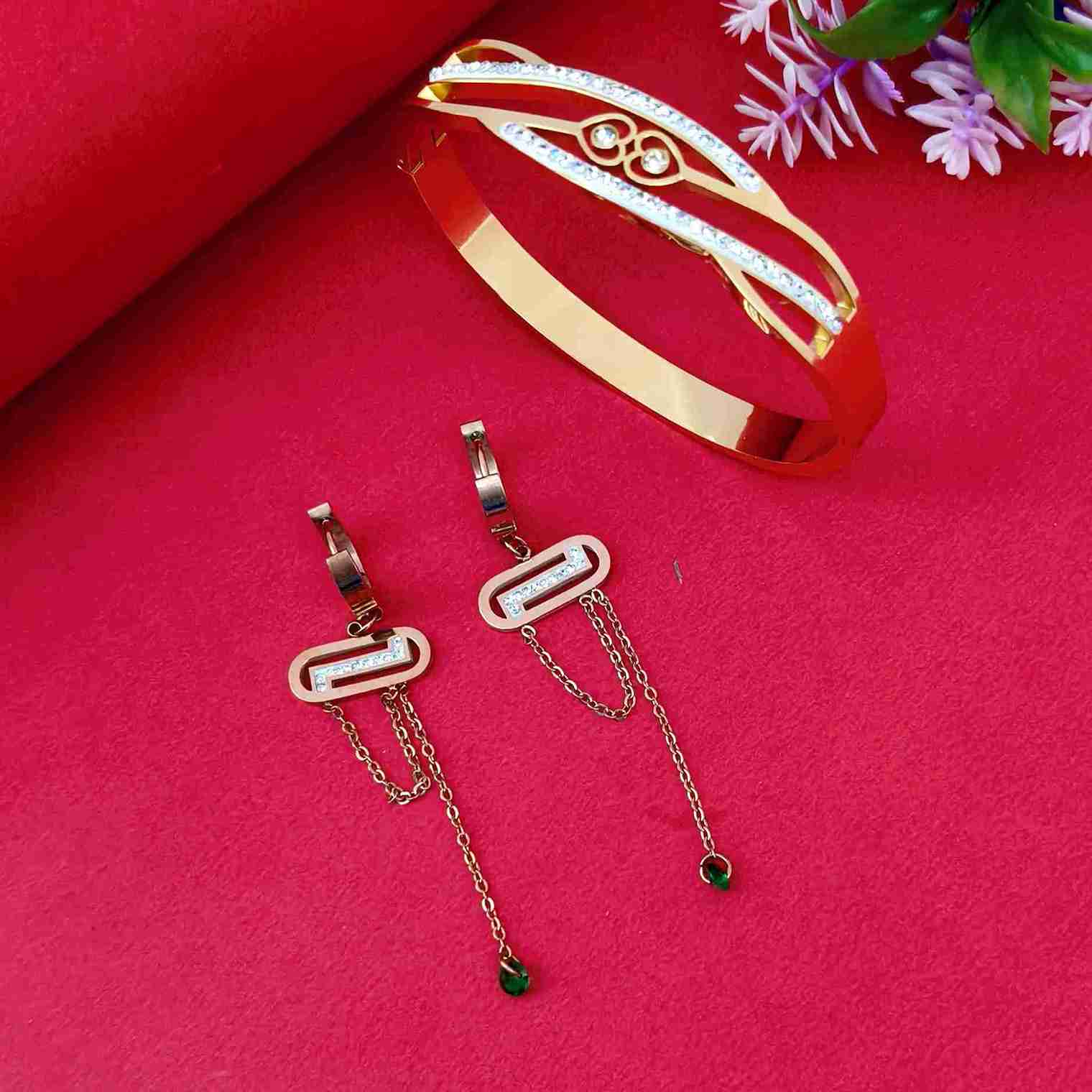 Upgrade your style with this stunning Gold Anti Tarnish Bracelet and Rose Gold Earrings Combo Set, specially designed for fashion-forward women and girls in Bihar. Crafted from premium stainless steel with an elegant elliptical design, this combo features a luxurious anti-tarnish finish that resists fading. Perfect for daily wear, festive occasions, and gifting, this artificial jewellery combo blends modern charm with long-lasting shine.