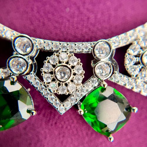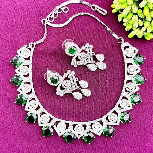 Add a touch of royalty to your style with this Green AAA Star Cut American Diamond Necklace Set, crafted from premium casting alloy with a gleaming silver finish. The square-cut lavender stones and sparkling American diamonds make it a perfect pick for weddings, festive occasions, and parties. Ideal for women in Bihar who love elegant and fashionable artificial jewellery that blends luxury with affordability.