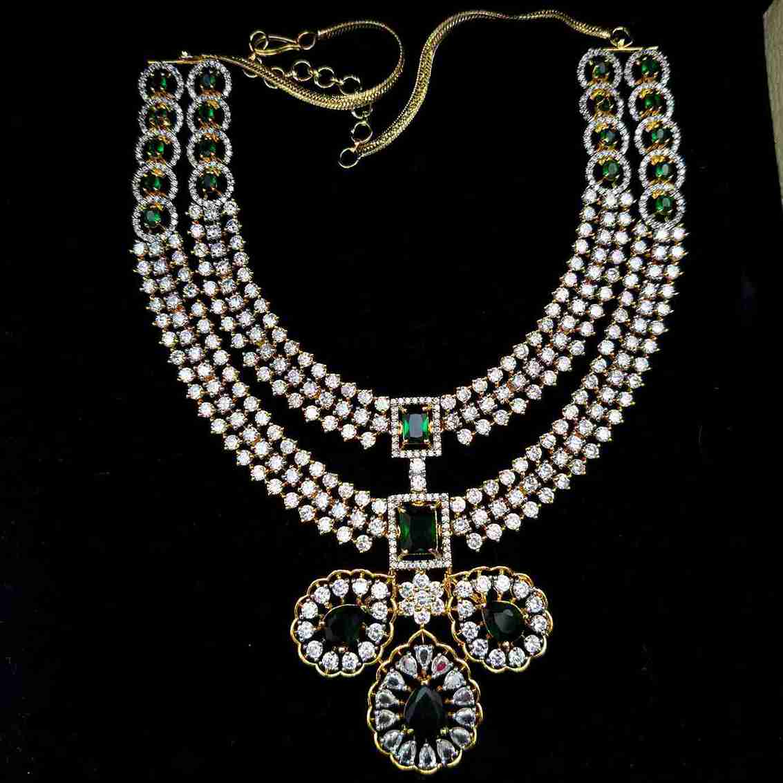 Crafted with precision, this double-layer necklace features vibrant green accents and shimmering American Diamonds, highlighted by a striking pendant. Ideal for festive occasions, parties, or elegant evenings, it complements both sarees and modern ethnic wear with effortless charm.