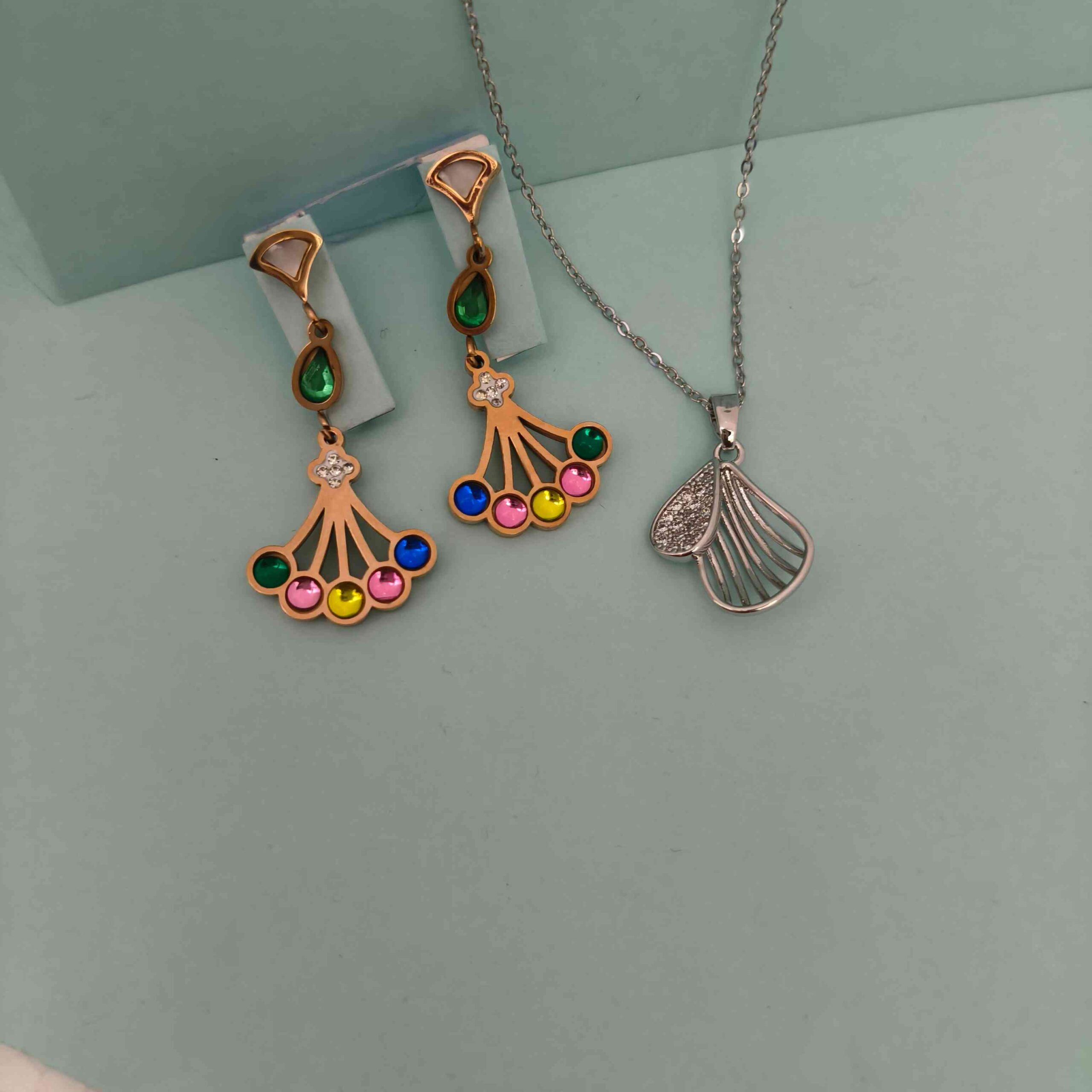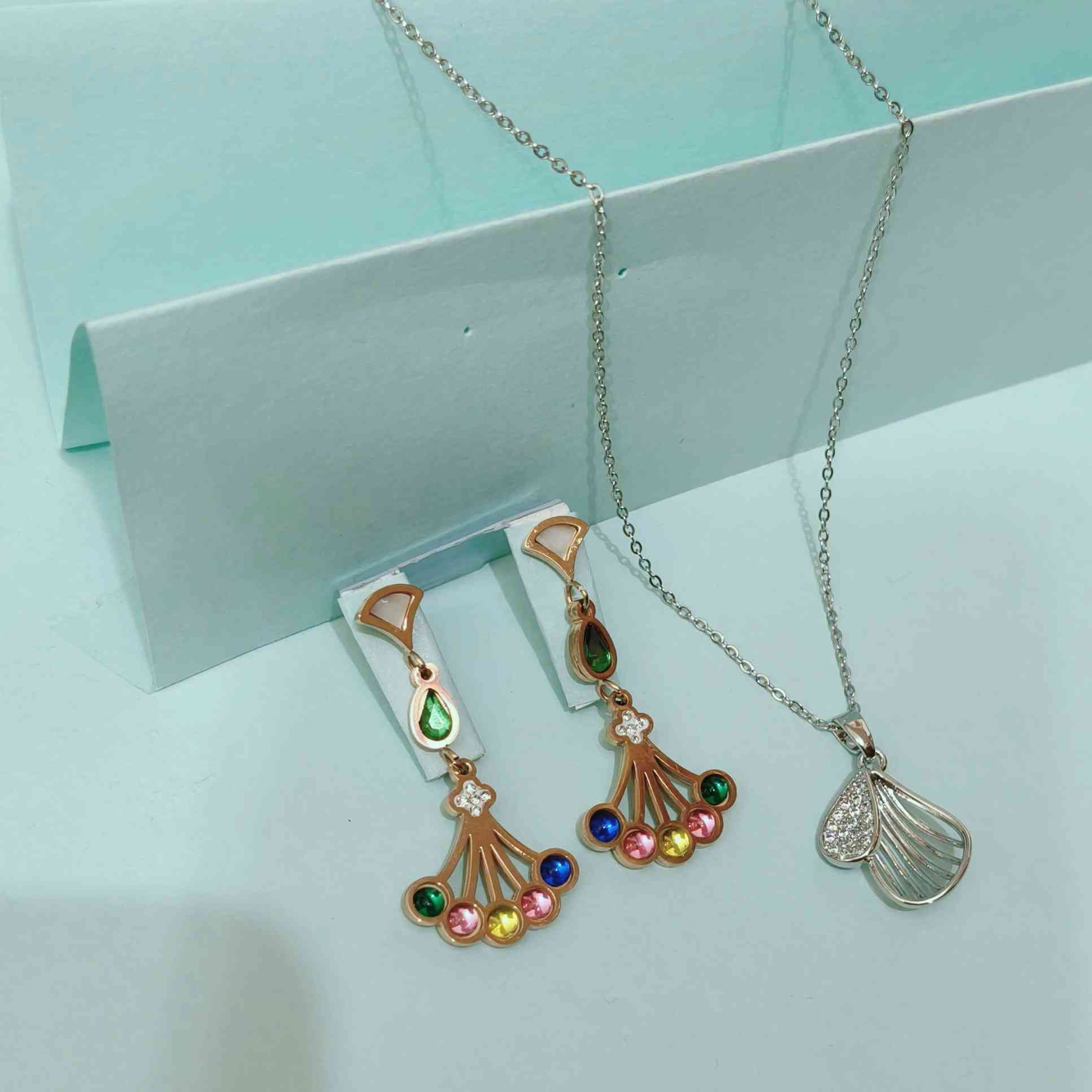 Add a splash of elegance to your look with this Multi Colour Anti Tarnish Earrings and Silver Chain Combo. Crafted from premium stainless steel with a luxurious rose gold finish, this rust-free jewellery set is perfect for daily wear or festive occasions. The vibrant multi-stone earrings paired with the sleek silver chain make it a trendy and durable choice for modern girls and women in Bihar who seek high-quality artificial jewellery.