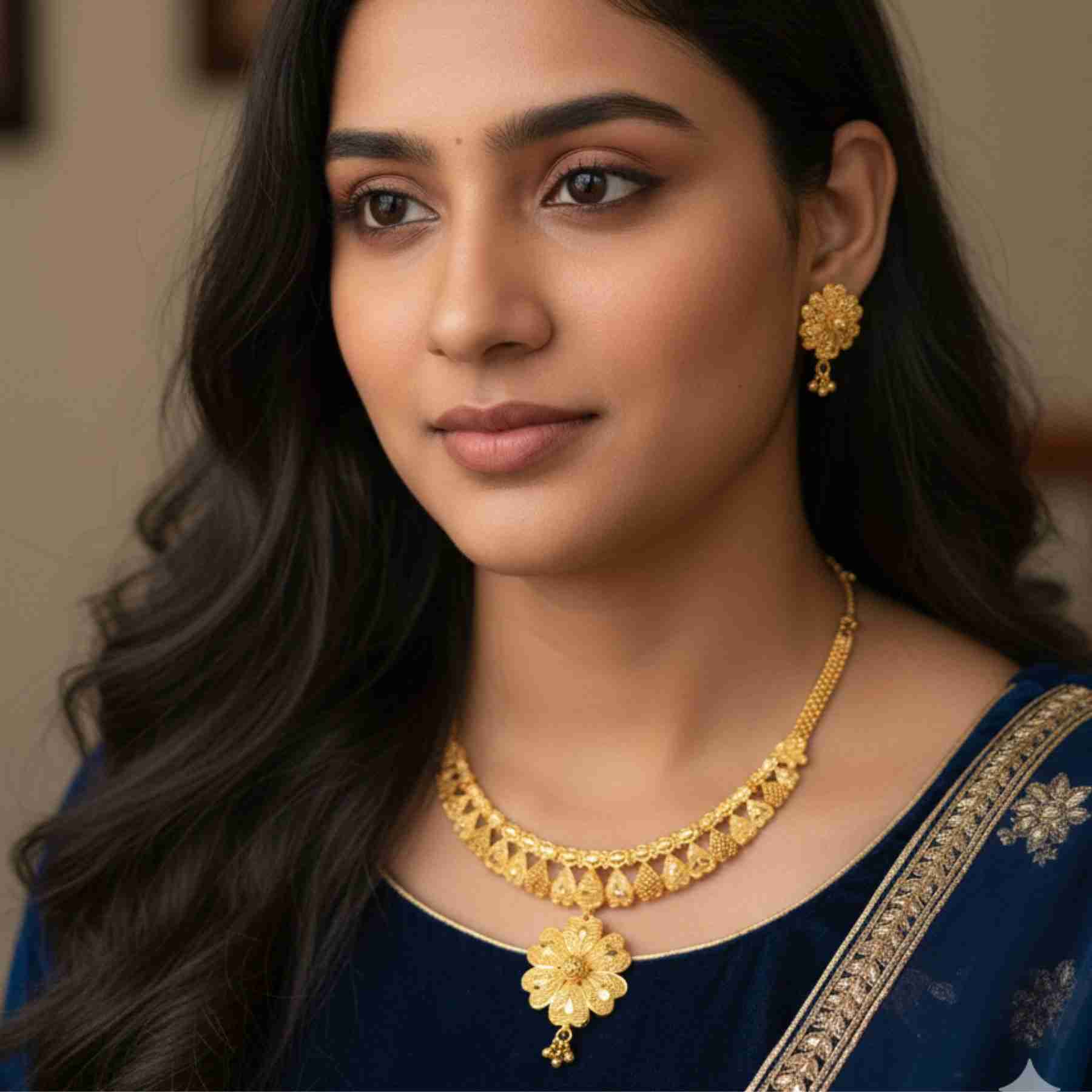 Crafted on a durable copper base and finished with real gold plating, this lightweight necklace set features a charming flower motif that blends tradition with comfort. Paired with matching earrings, it’s ideal for daily wear, festive functions, or adding a soft, feminine touch to your ethnic outfits.