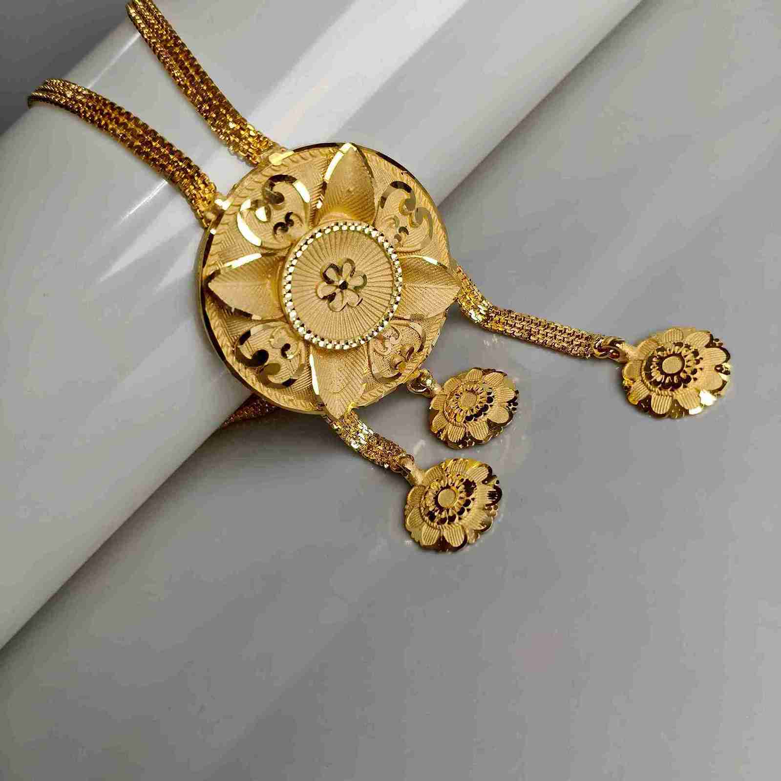Add timeless charm to your ethnic look with this Forming Gold Long Chain Necklace Set with Matching Earrings featuring an elegant round flower design. Made from high-quality copper metal with a radiant gold finish, this lightweight jewellery set blends traditional beauty with modern craftsmanship. Ideal for women in Bihar who love artificial gold jewellery for weddings, festive occasions, and parties. A must-have accessory for enhancing your cultural elegance.