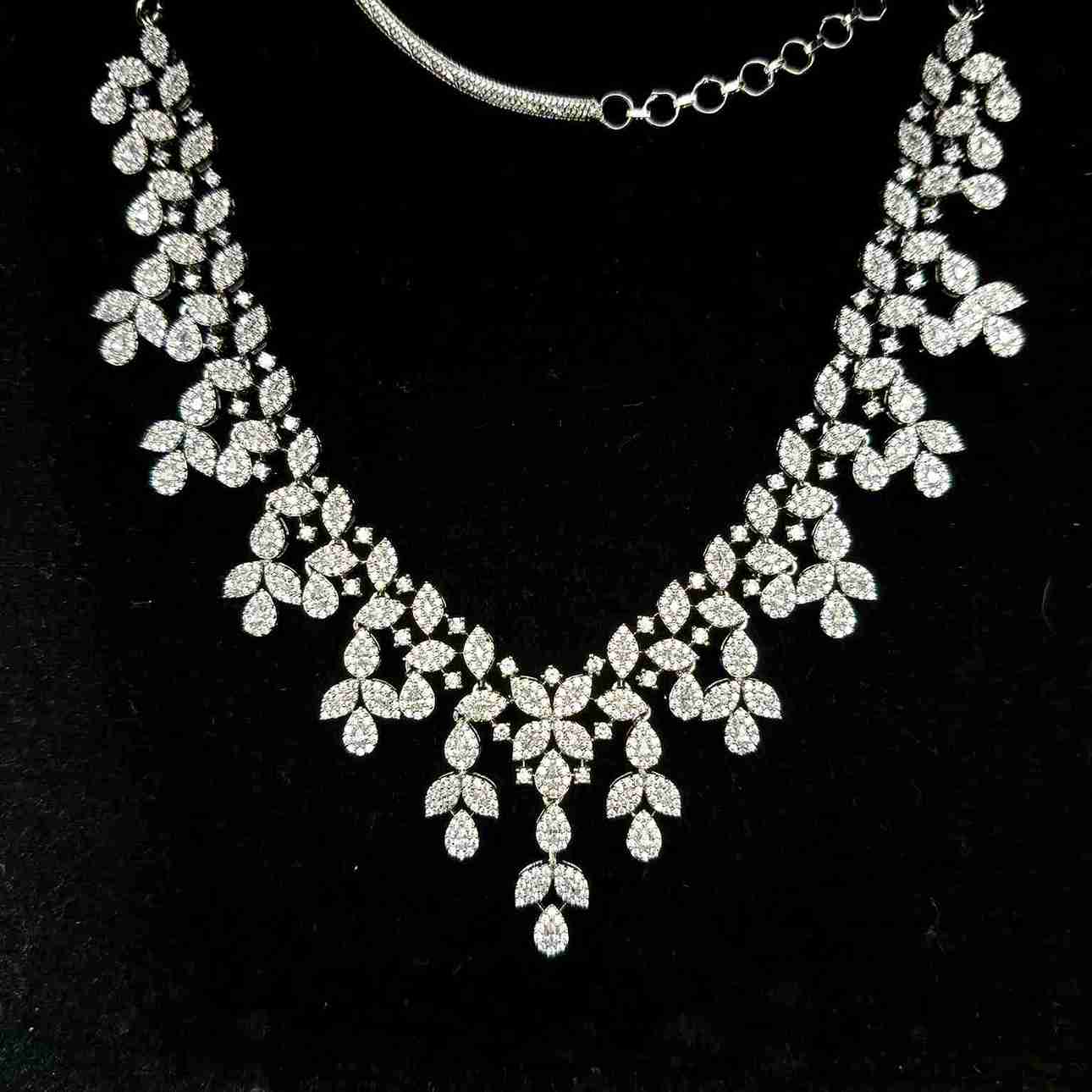 The Silver Flower Design Micro American Diamond Necklace Set blends floral elegance with subtle sparkle. Perfect for women who love understated glam, this piece elevates ethnic wear like sarees, salwar suits, and lehengas with its refined silver tone and intricate flower motifs. Ideal for receptions, festive evenings, or intimate celebrations, it adds just the right touch of grace and charm.