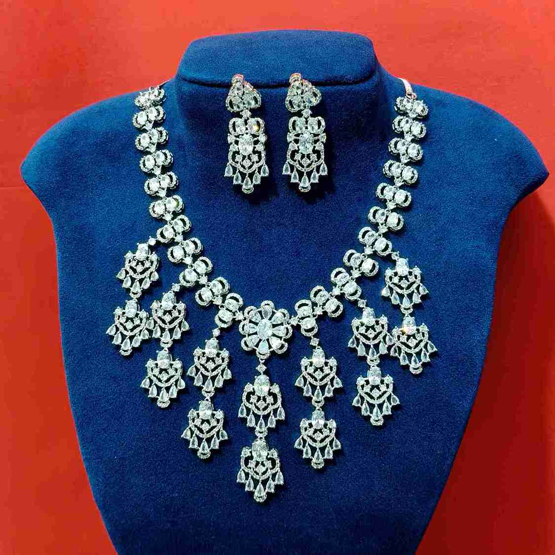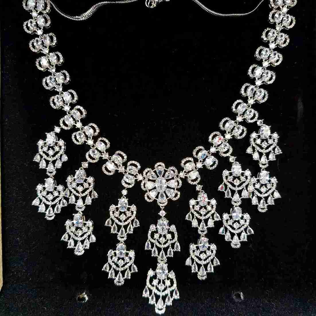 The Silver Flower Design Micro American Diamond Necklace Set blends floral elegance with subtle sparkle. Perfect for women who love understated glam, this piece elevates ethnic wear like sarees, salwar suits, and lehengas with its refined silver tone and intricate flower motifs. Ideal for receptions, festive evenings, or intimate celebrations, it adds just the right touch of grace and charm.